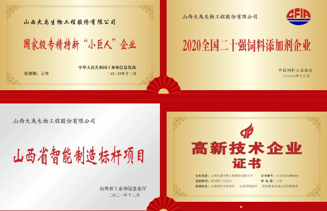 大禹生物成立于2014年,主營業(yè)務(wù)為飼料添加劑、飼料及獸藥的研發(fā)、生產(chǎn)與銷售。先后榮獲國家級專精特新“小巨人”企業(yè)、全國二十強飼料添加劑企業(yè)、山西省智能制造標桿項目、山西省質(zhì)量獎提名獎、山西省企業(yè)技術(shù)創(chuàng)新獎等榮譽。
